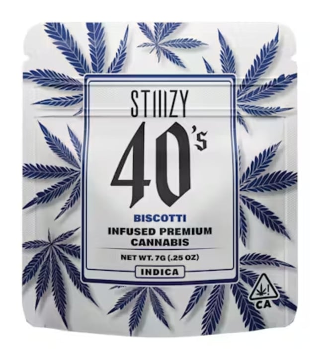 Elevate your flower experience with the new STIIIZY 40’s infused flower. We have expanded our 40’s line by incorporating our premium cannabis flower infused with our finest THC-A Diamonds for an extra punch. We call them 40's because our infused flower strains are potent, testing around 40% +/- total cannabinoids. Now you can roll your own 40’s with STIIIZY infused flower, the possibilities are endless with unmatched potency. BISCOTTI TASTE: Earthy, Pine, Nutty FEELING: Relaxing, Sleepy, Giggly DESCRIPTION: An Indica-dominant strain that comes from Gelato #25 and South Florida OG. Biscotti has a rich sensory profile and combines savory and nutty undertones. Flavors Earthy Coffee Sweet