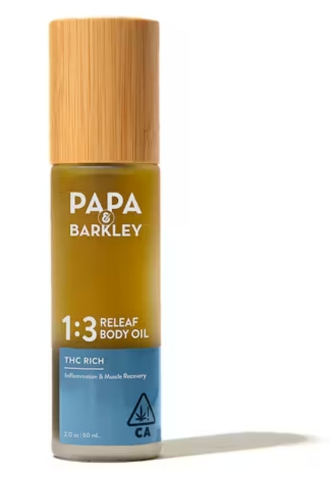 "THC-rich body oil designed to support muscle recovery and promote healthy joint function and mobility. The 1:3 Releaf Body Oil is rich in THC, making it ideal for easing muscle tension, discomfort, and supporting joint and muscle comfort. This fast-absorbing, lightweight oil is blended with calming essential oils, delivering the ultimate combination of relaxation, targeted relief, and skin hydration. Use for localized care or apply all over for whole-body support. Papa & Barkley’s Releaf Body Oil is crafted using our signature solventless, chemical-free infusion process, preserving the plant’s full spectrum of cannabinoids, terpenes, and phytonutrients for maximum therapeutic benefits. Product Cannabinoids: 400mg total (100mg CBD, 300mg THC) Product Weight: 60ml (2.0oz) Ingredients: Cannabis, Fractionated Coconut Oil, Jojoba Oil, Essential Oil Blend (Eucalyptus, Tea Tree, Peppermint, Lavender), Vitamin E Oil Directions: Apply 3 or more pumps to the desired area and rub in for 20-30 seconds. Repeat as often as needed. This statement has not been evaluated by the Food and Drug Administration. This product is not intended to diagnose, treat, cure, or prevent any disease."
